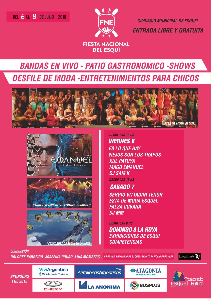Bandas en vivo, patio gastronómico, shows, desfile de moda, entretenimientos para chicos, son algunas de las propuestas que ofrece este año la renovada Fiesta Nacional del Esquí, organizada por la Municipalidad de Esquel y el productor Renato Papiccio.